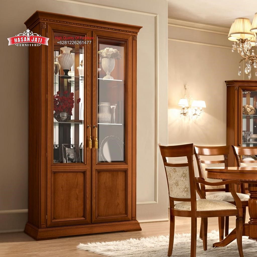 Lemari Hias Jati klasik desain elegan model 2 pintu kaca