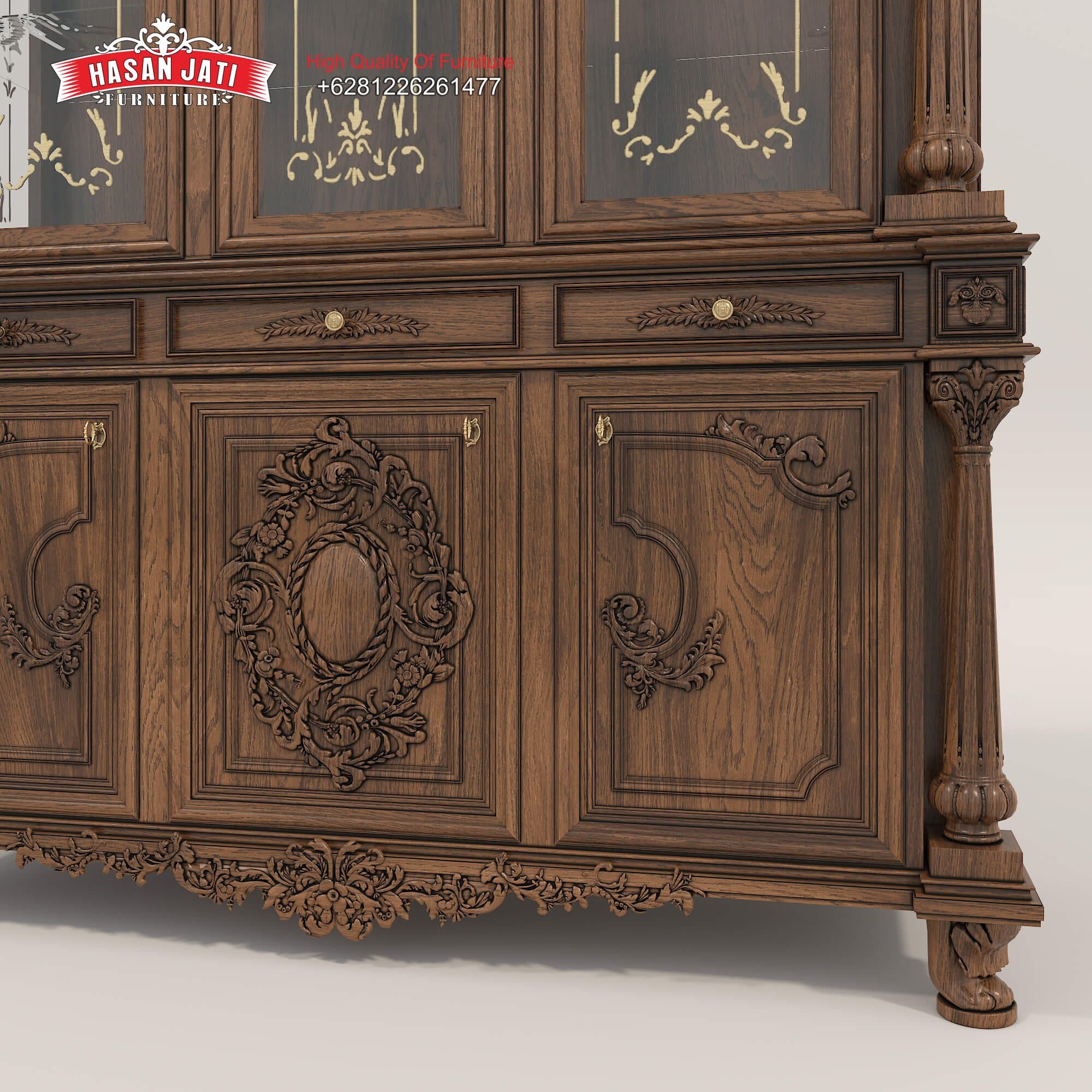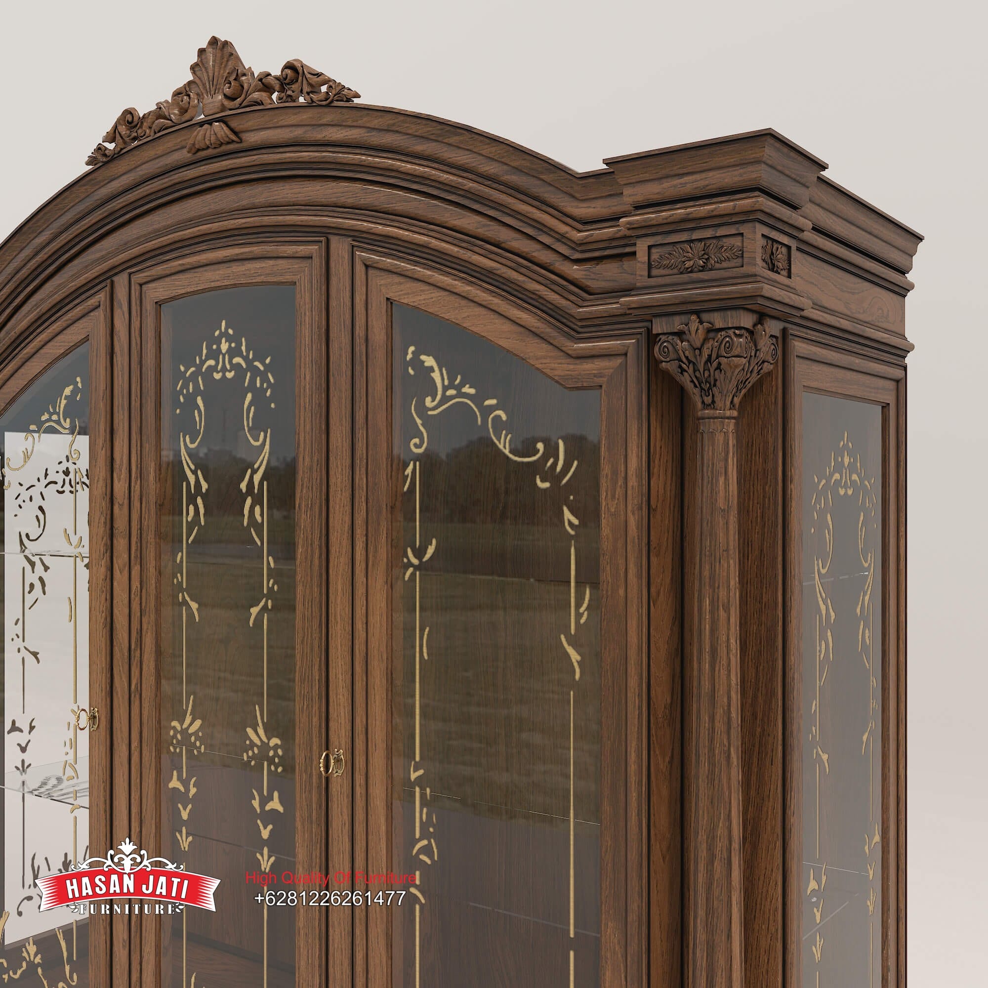 Dengan sentuhan ukiran khas dan detail yang rumit, lemari hias klasik mewah mampu menciptakan suasana yang mewah dan berkelas di dalam ruangan. - Pintu Kaca untuk Tampilan Estetik