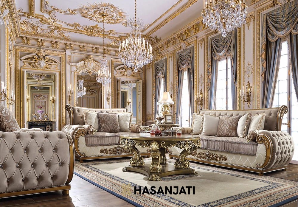 sofa tamu mewah ukiran Jepara warna gold elegan dalam ruangan